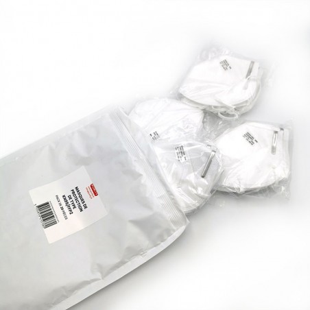 Masques protection respiratoire FFP2 à usage unique.Conforme à la norme KN95 qui certifie une performance filtrante d'au moins 95% (94% pour le FFP2).Composé de 3 couches filtrantes et respirantes.Bande de pince-nez réglable, s'adapte bien au visage.Pack de 10 sachets hermétiques de 5 masques.